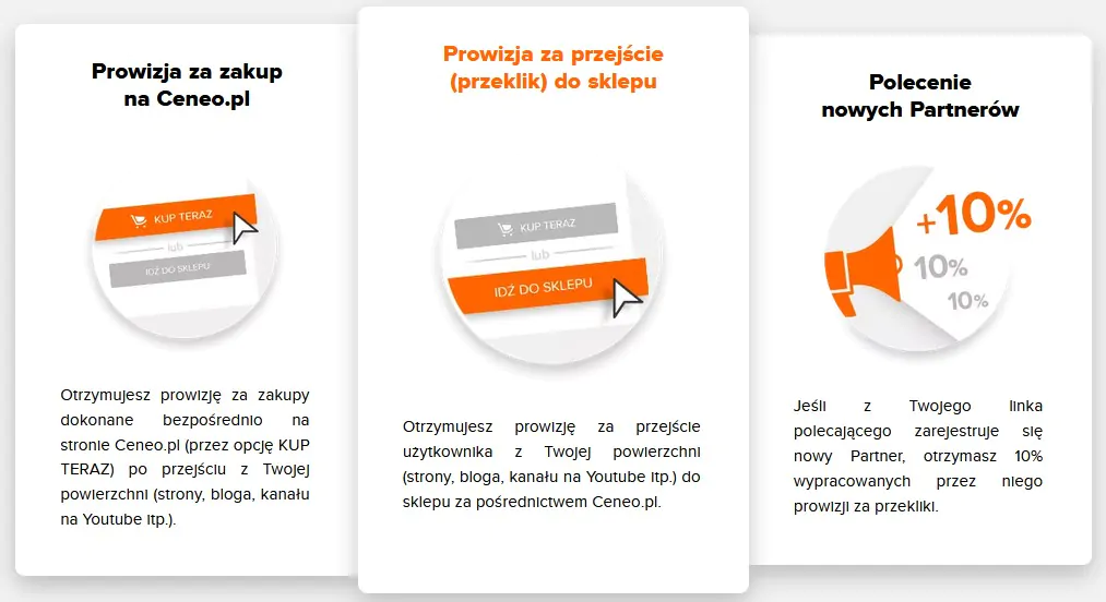 Jak twórcy mogą zarabiać w PP Ceneo? Wystarczy umieścić link, banner czy inne narzędzie na swoim kanale – stronie lub blogu itp. Użytkownik klika w reklamę i przechodzi na Ceneo.pl, gdzie może porównać ceny danego produkty i przeczytać opinie na jego temat. Jeżeli przeklika się do wybranego sklepu – prowizja zostaje przyznana Partnerowi. Prowizja wypłacana jest również wtedy, gdy użytkownik dokona zakupu bezpośrednio na Ceneo.