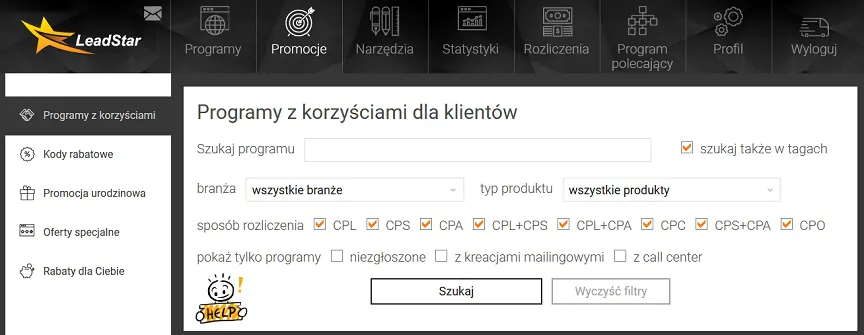 Leadstar należy do najprężniej rozwijających się programów afiliacyjnych w naszym kraju. Zamysł tego programu jest prosty – jako afiliant określasz to, w jaki sposób chcesz reklamować usługi lub produkty, a także swój poziom doświadczenia w tego typu współpracach. Leadstar na podstawie dostarczonych informacji stara się dobrać oferty na miarę indywidualnych potrzeb. Plusem jest zatem to, że współpraca z jedną platformą umożliwia reklamowanie wielu różnych usług i produktów.