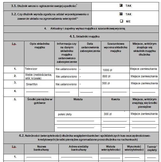 - Składniki majątku – w formularzu wymień cały posiadany majątek, w tym m.in. telefon, odzież, meble, sprzęt RTV i AGD, bez konieczności szczegółowego opisywania np. każdego elementu garderoby. Trzeba wskazać, czy na przedmiotach ustanowiono zabezpieczenie, podać datę jego powstania oraz oszacować wartość majątku, uwzględniając stopień zużycia. W przypadku posiadania środków pieniężnych należy określić ich wartość, walutę i miejsce przechowywania.